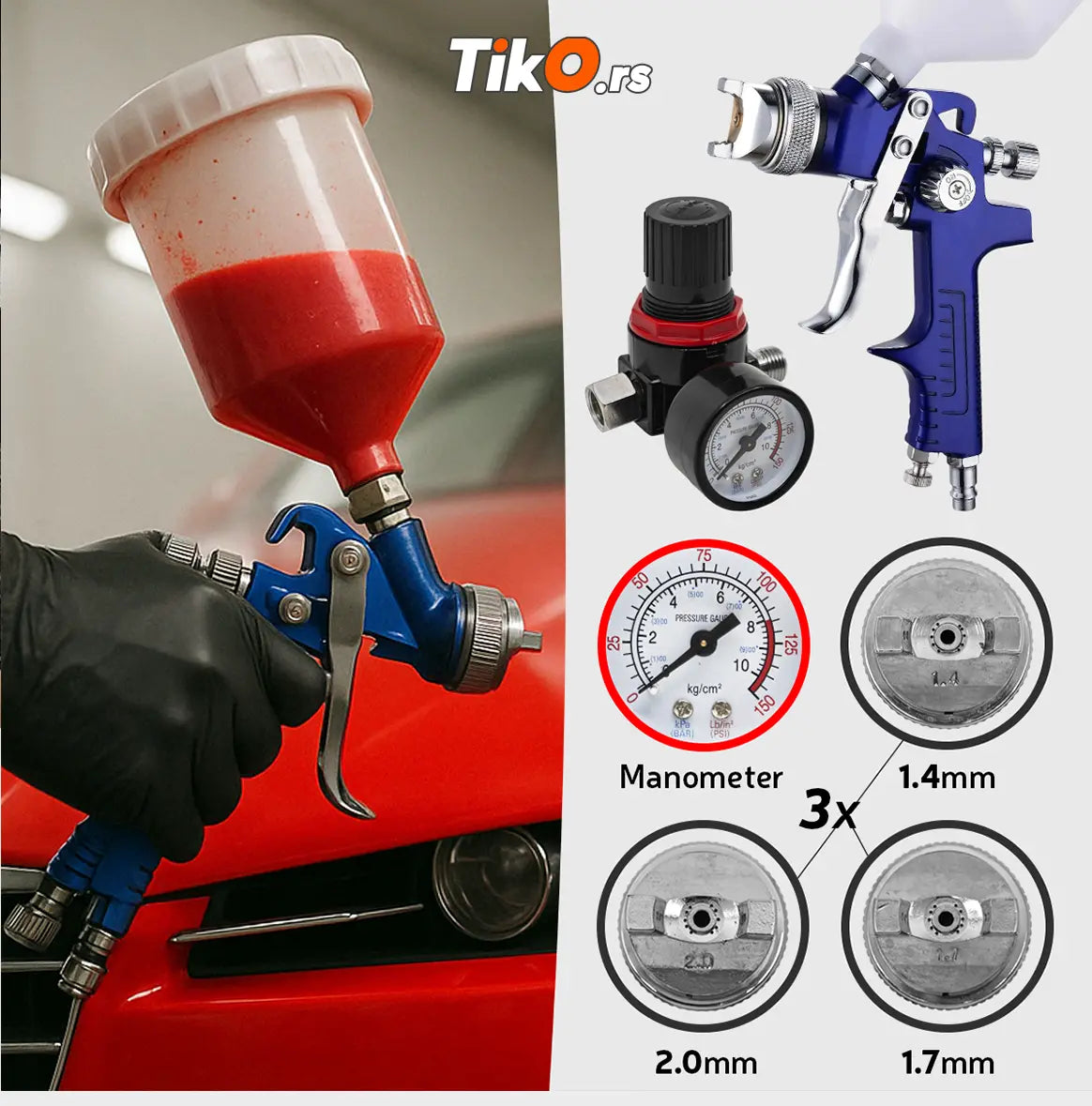 HVLP PIŠTOLJ ZA LAKIRANJE Višenamenska upotreba: Savršen za farbanje automobila, lakiranje nameštaja, zidova, umetničke projekte i bazne premaze. 3 zamenljive mlaznice i igle – 1.4mm, 1.7mm, 2.0mm za različite vrste boja i premaza Smanjena potrošnja boje – HVLP tehnologija smanjuje otpad i omogućava precizno nanošenje ️ Visokokvalitetni materijali – mlaznica i igla od nerđajućeg čelika za dugotrajnu upotrebu Ergonomski dizajn – lagan i jednostavan za rukovanje, pogodan za početnike i profesionalce Jednostavno čišćenje – glatka površina omogućava lako održavanje i dug vek trajanja pištolja 🧼