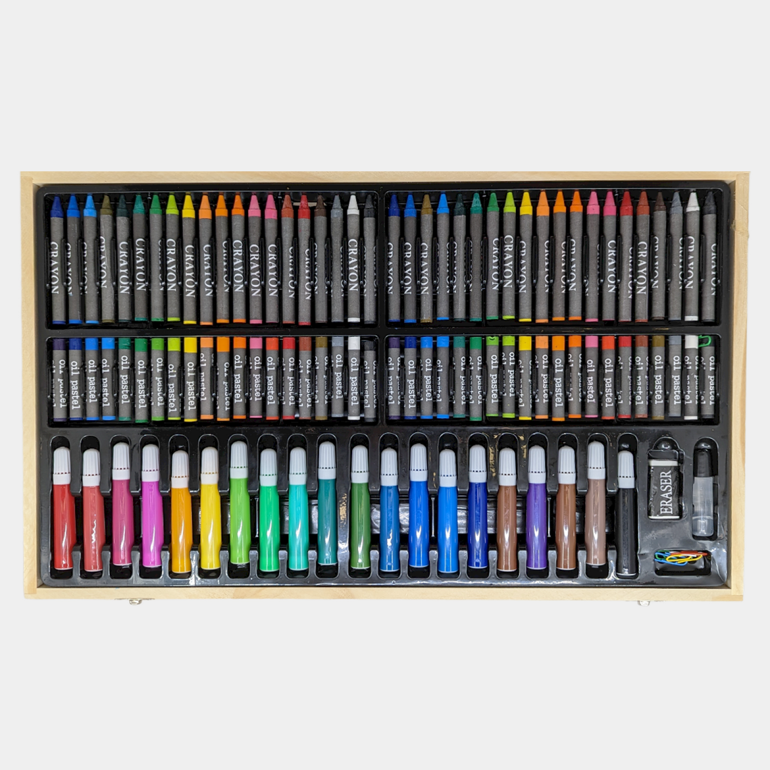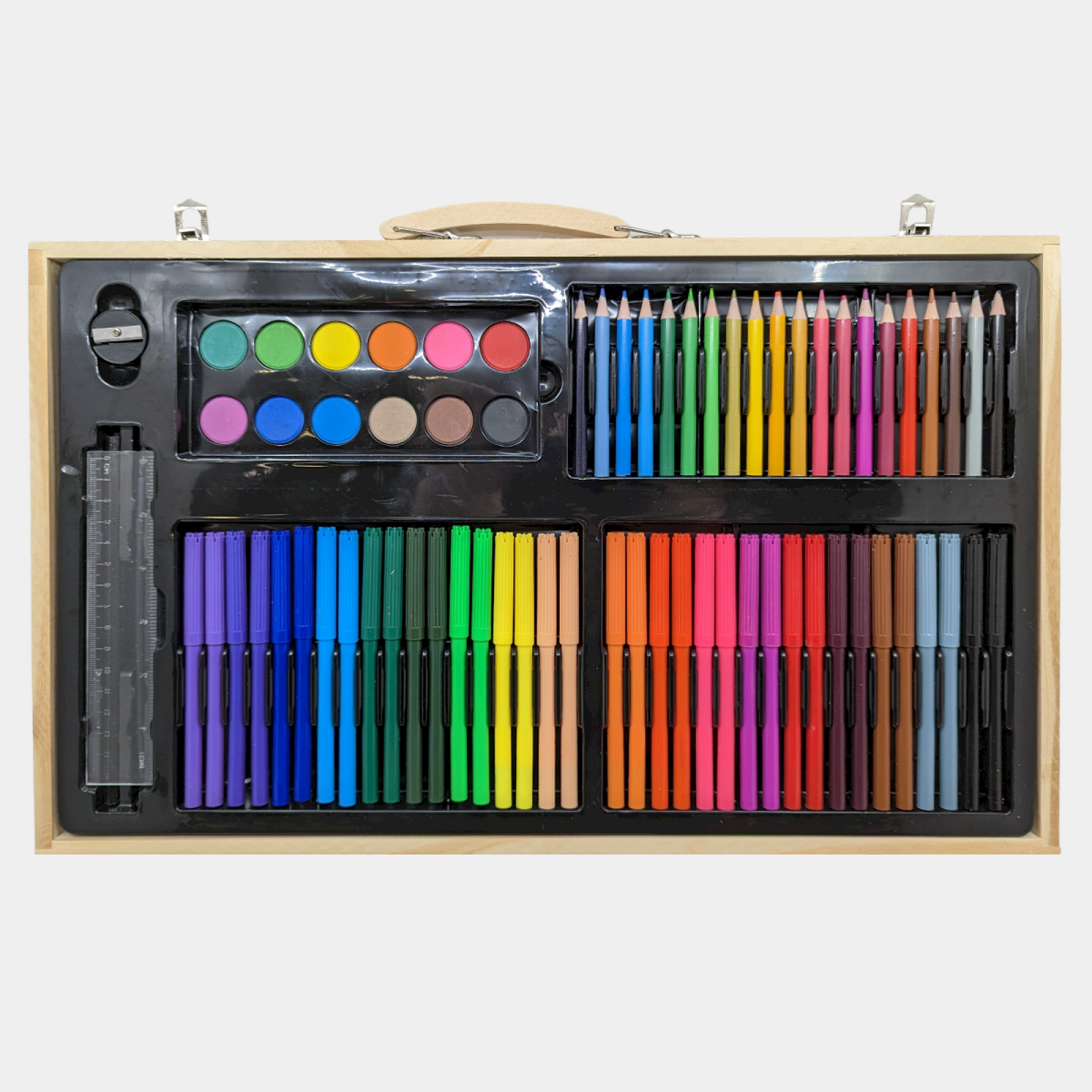 Set za likovno stvaralaštvo "Wood" sada dostupan Visokokvalitetni drveni set za slikanje sa 180 delova "Wood" Fantastičan set za školarce - odvojite ih od mobilnih telefona i dozvolite im da budu kreativni Dimenzije otvorenog kofera su 50 x 60 cm, zatvorenog 50 x 30 cm Set sadrži sve što je prikazano na slici 40 komada uljnih pastela 40 komada običnih pastela 20 drvenih bojica 36 klasičnih flomastera Guma, ulje, spajalice, vodene boje, ravnilo, oštrač i još nekoliko iznenađenja, sve zajedno u prelepom drvenom koferu.