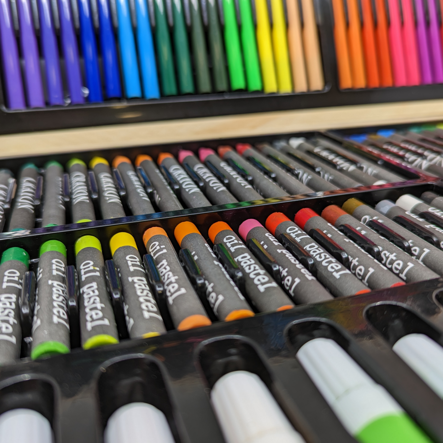 - Set za likovno stvaralaštvo "Wood" sada dostupan Visokokvalitetni drveni set za slikanje sa 180 delova "Wood" Fantastičan set za školarce - odvojite ih od mobilnih telefona i dozvolite im da budu kreativni Dimenzije otvorenog kofera su 50 x 60 cm, zatvorenog 50 x 30 cm Set sadrži sve što je prikazano na slici 40 komada uljnih pastela 40 komada običnih pastela 20 drvenih bojica 36 klasičnih flomastera Guma, ulje, spajalice, vodene boje, ravnilo, oštrač i još nekoliko iznenađenja, sve zajedno u prelepom drvenom koferu.
