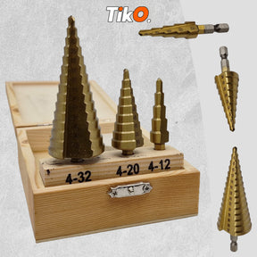 • Materijal:HSS čelik, prekriven titanijumskim slojem Prečnik bušenja: 4 – 32 mm Namena: metal, drvo, plastika Razmak: svaka 2 mm Stezaljka: cilindrična Set sadrži: 3 komada: 4-32mm, 4-20mm i 4-12mm HSS Drveni kofer